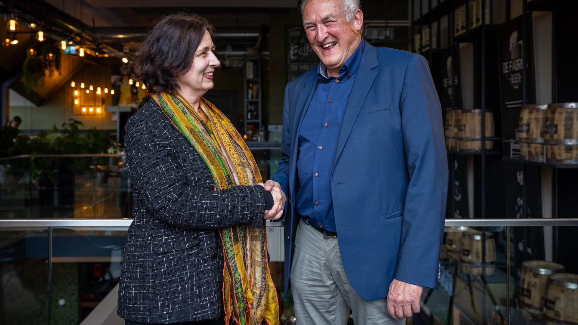 Kunstwegen – de museale openluchtroute met werken van internationaal gerenommeerde kunstenaars langs de Vecht tussen Zwolle en Nordhorn – krijgt onderdak bij Museum de Fundatie. Met haar rijke collectie, beeldentuin en spraakmakende tentoonstellingen wil het museum de zichtbaarheid van kunst in de openbare ruimte vergroten en toegankelijk maken voor een breder publiek. Donderdag 17 april, werd het nieuwe bestuur geïnstalleerd. Foto: Beatrice von Bormann (Museum de Fundatie) en Geert de Groot (voormalig voorzitter Stichting Kunstwegen), fotograaf: Nienke de Groot